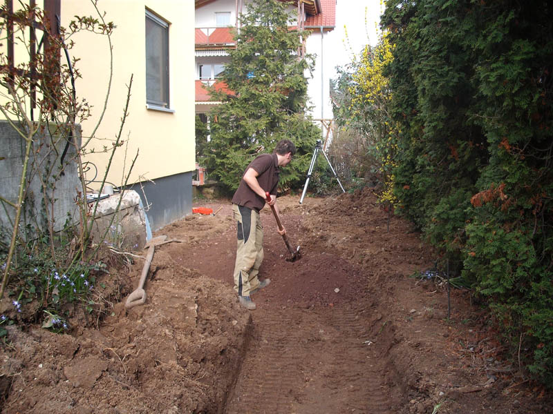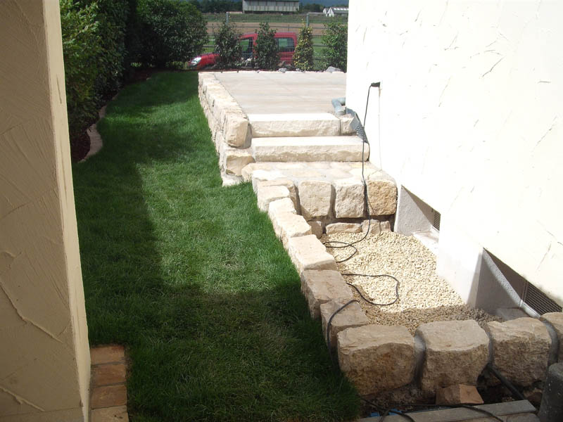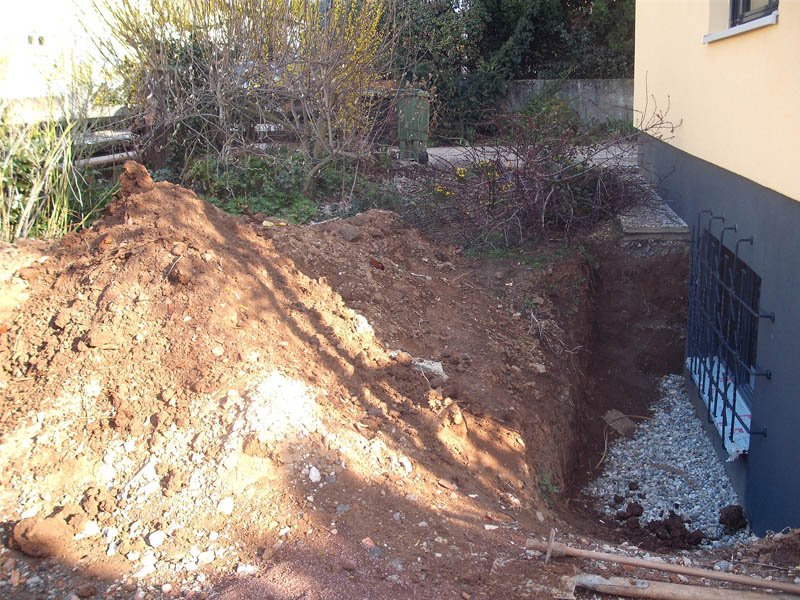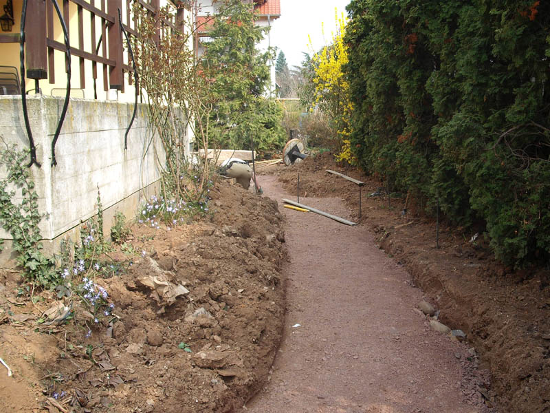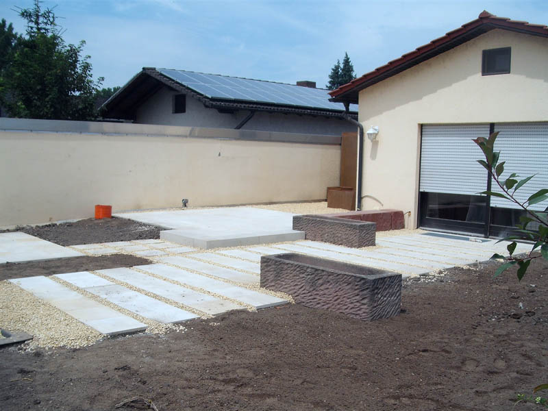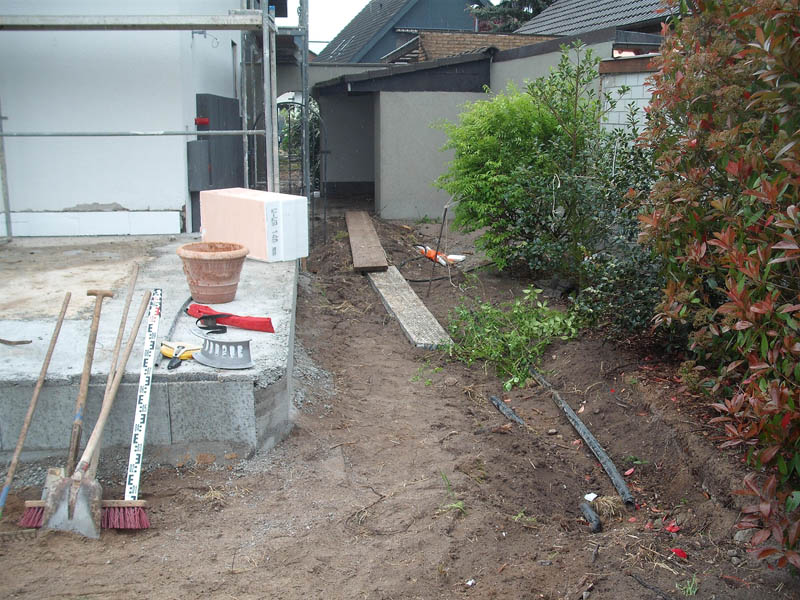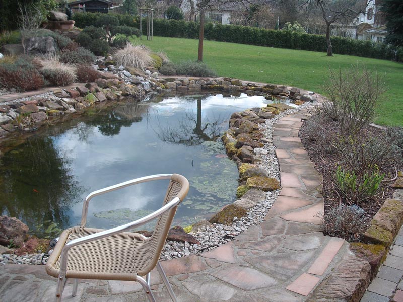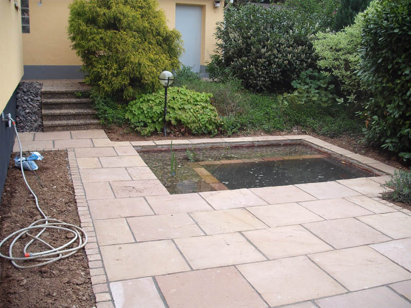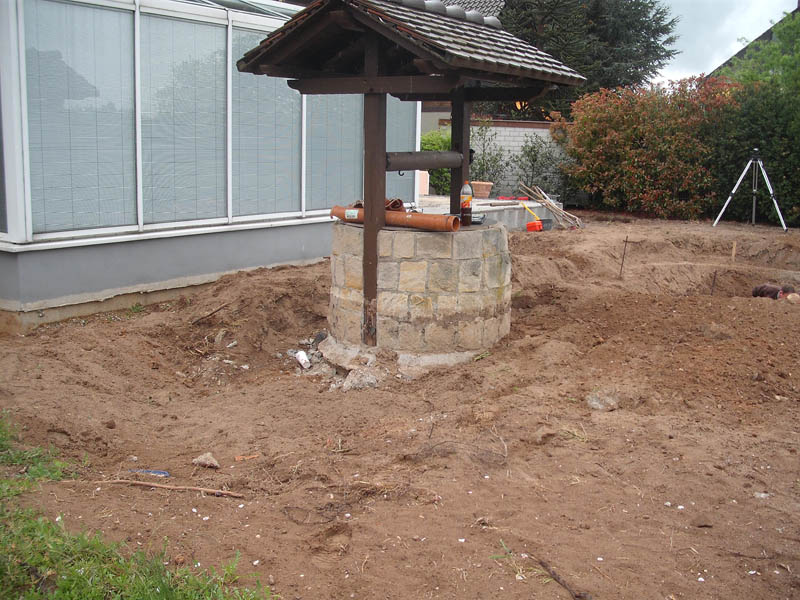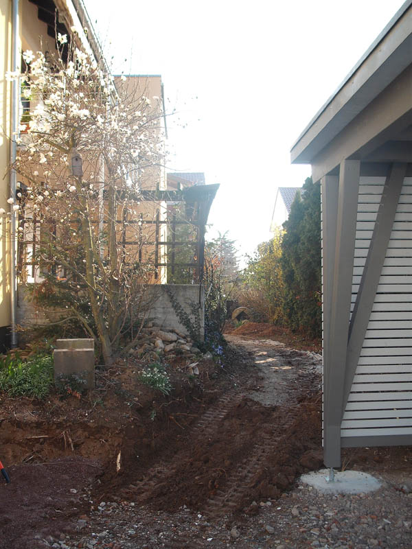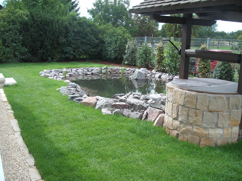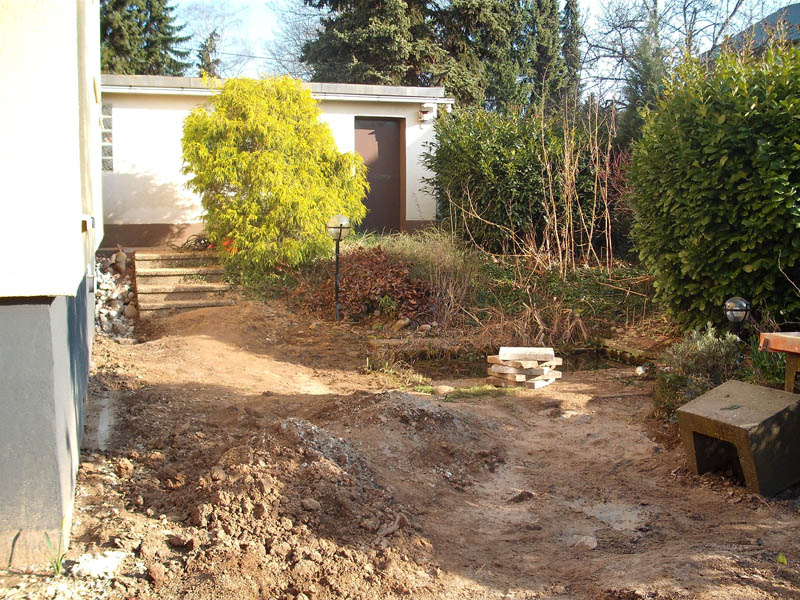 Stichworte: Teichgestaltung, Terrasse und Gartenwege, Lichtschacht, Natursteintreppe, Carport, Rollrasen, Sandsteinmauer, Kalksteinmauer