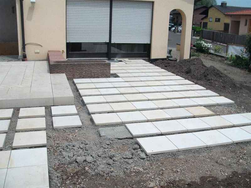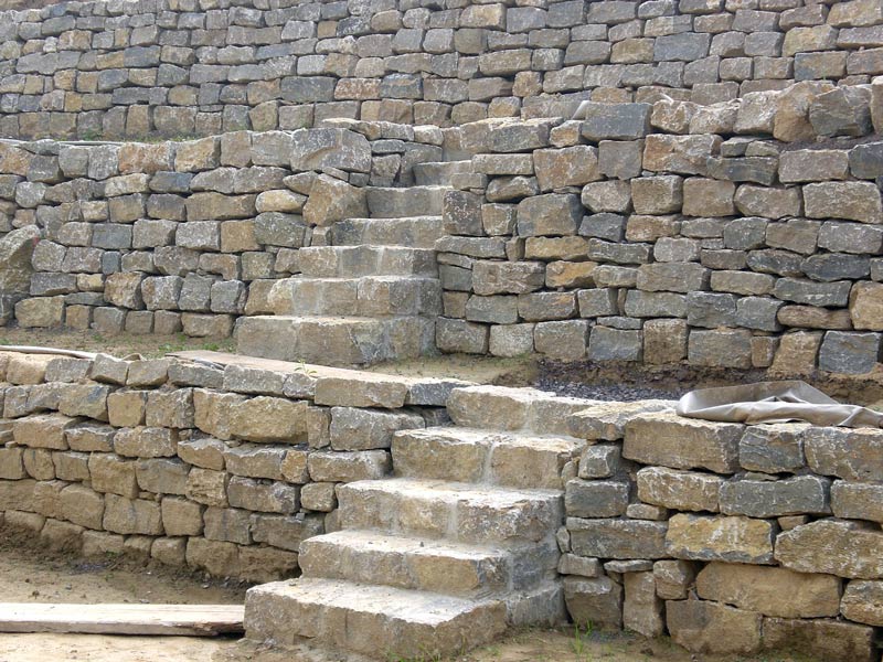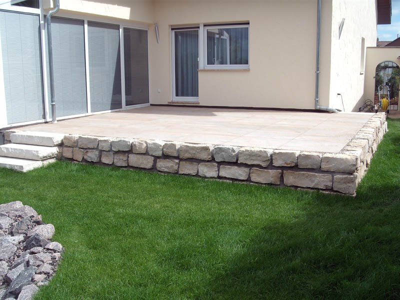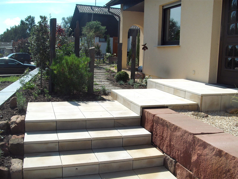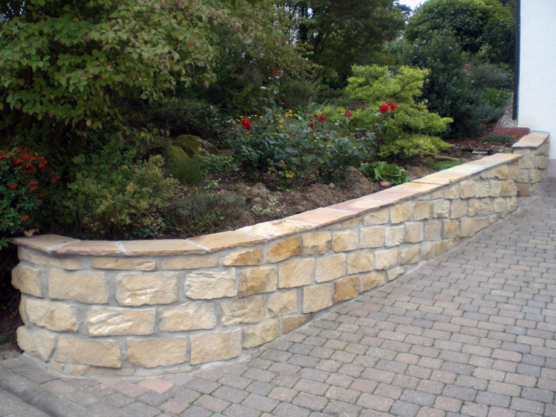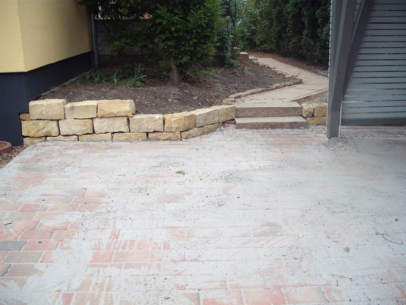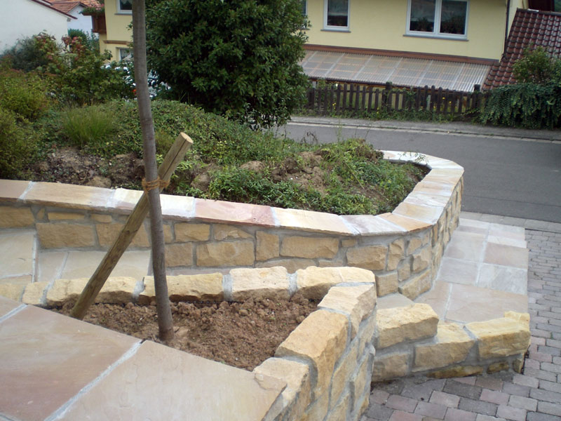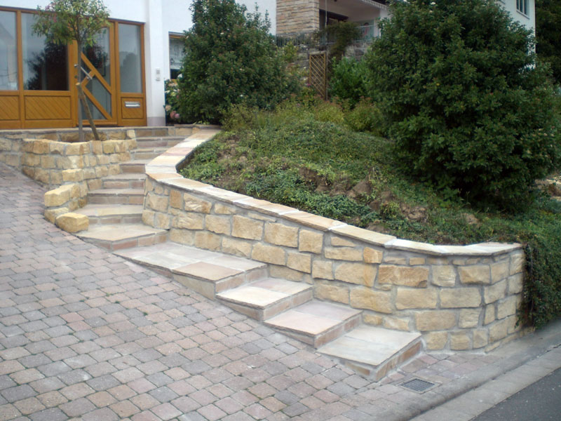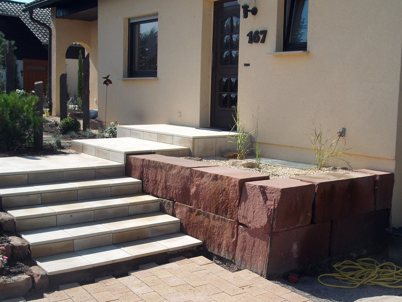 Stichworte: Sandsteinverblendung, Buntsandstein, Sandsteinmauer, indischer Sandstein, Betonpflaster, Findlinge, Basalt, Cassero