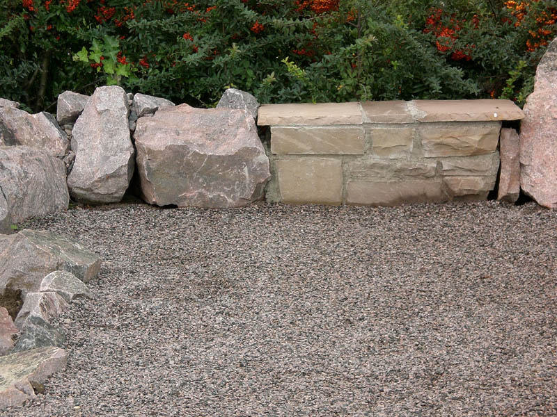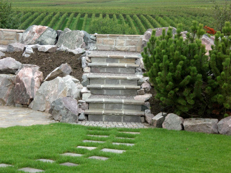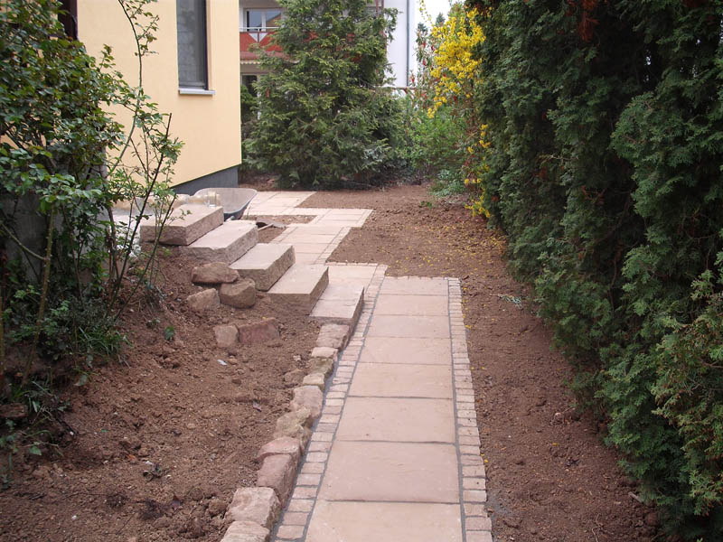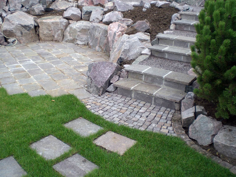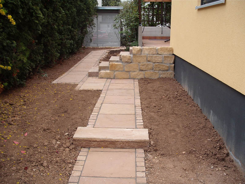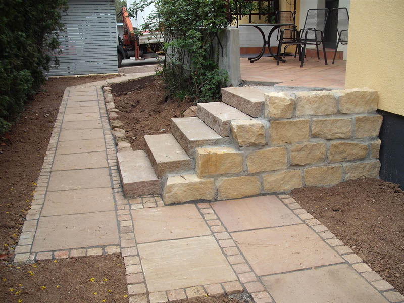 Stichworte: Gartenwege, Natursteintreppe, Findlinge Granit, Pflanzbeete, indischer Sandstein, Porphyr
