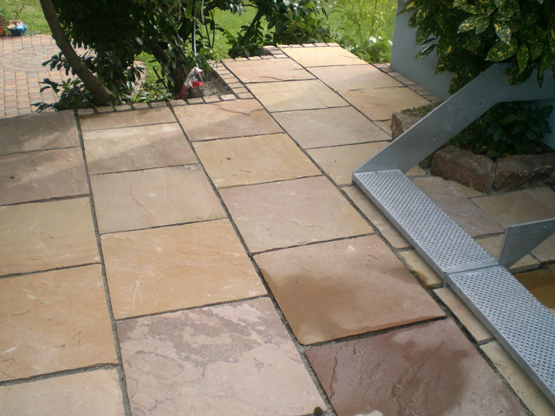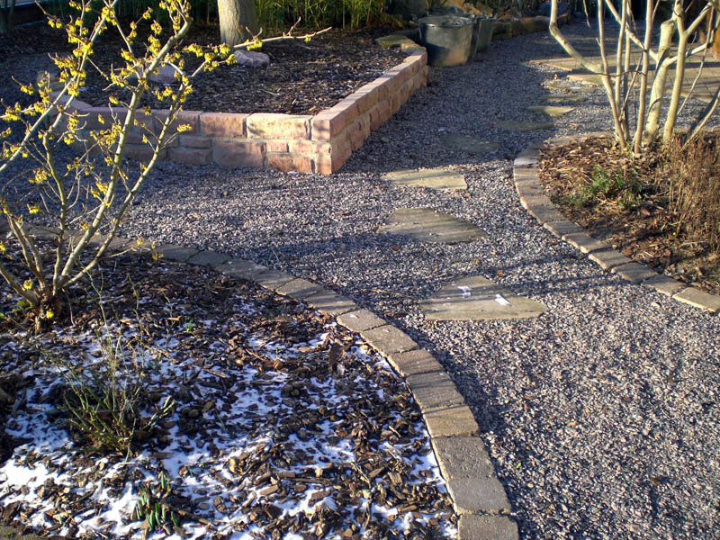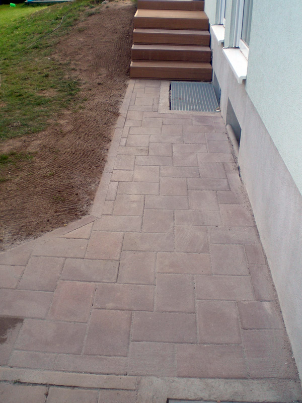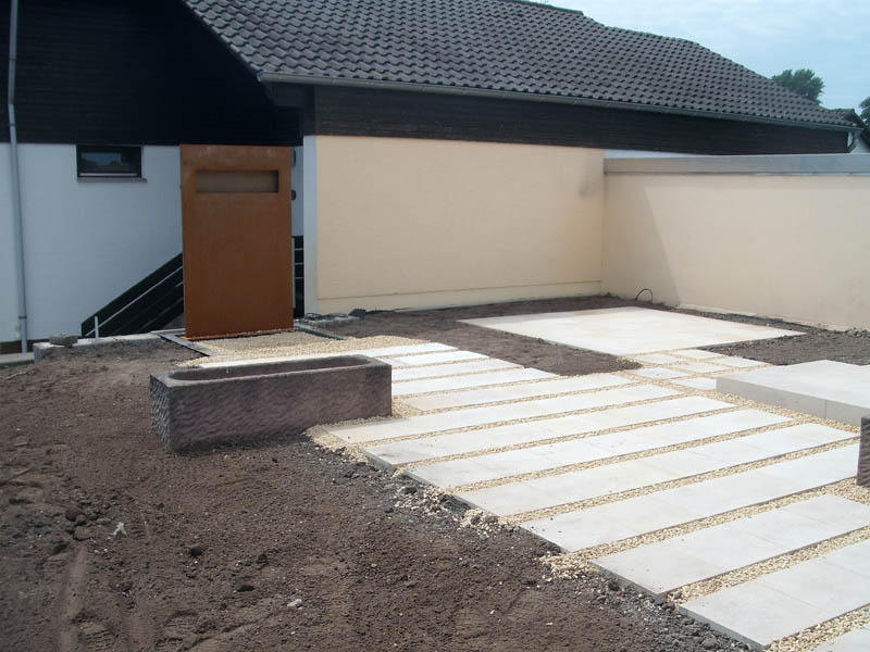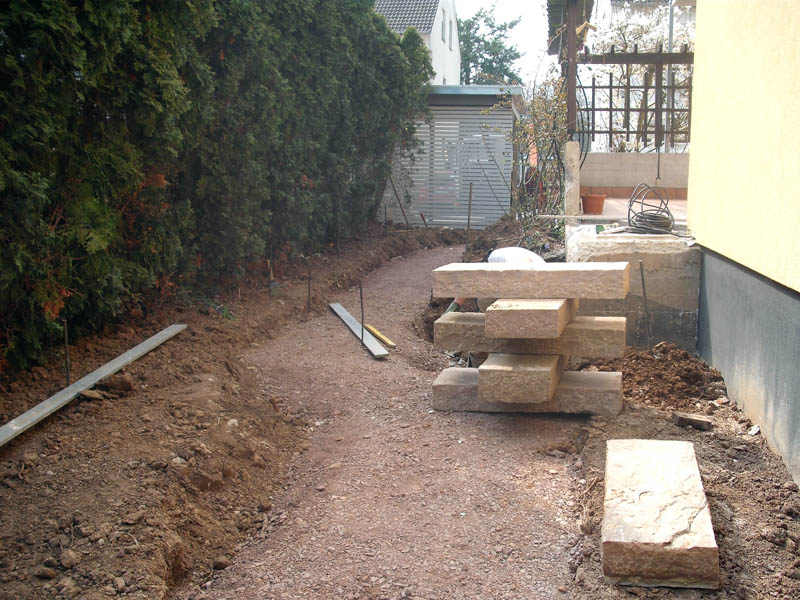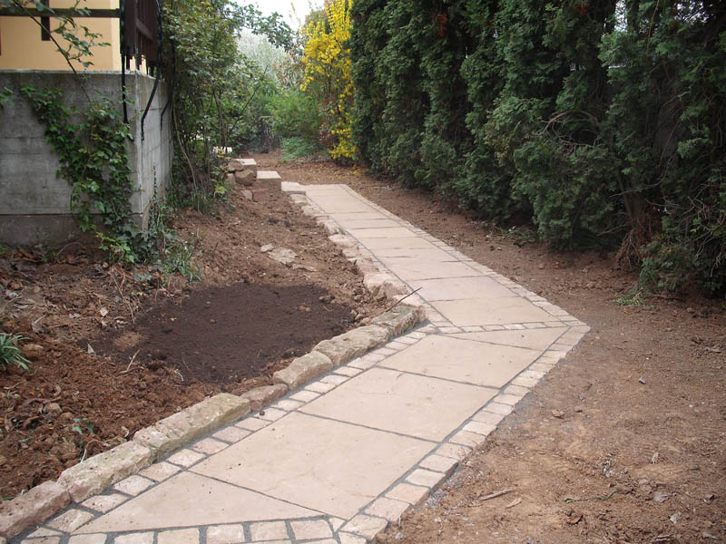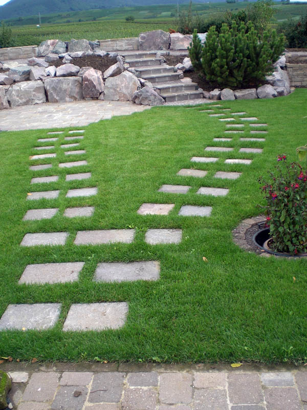 Stichworte: Gartenwege, Natursteintreppe, Findlinge Granit, Pflanzbeete, indischer Sandstein, Porphyr