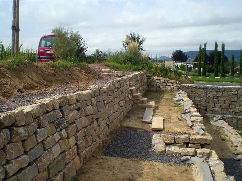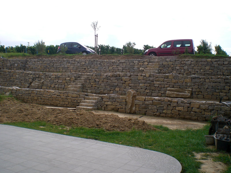 Stichworte: Trockenmauer Kalkstein, Natursteintreppen, Begrünung Baumarkt-Parkplatz